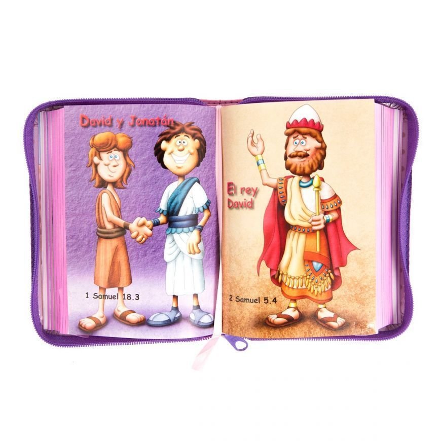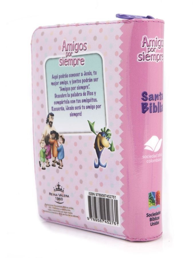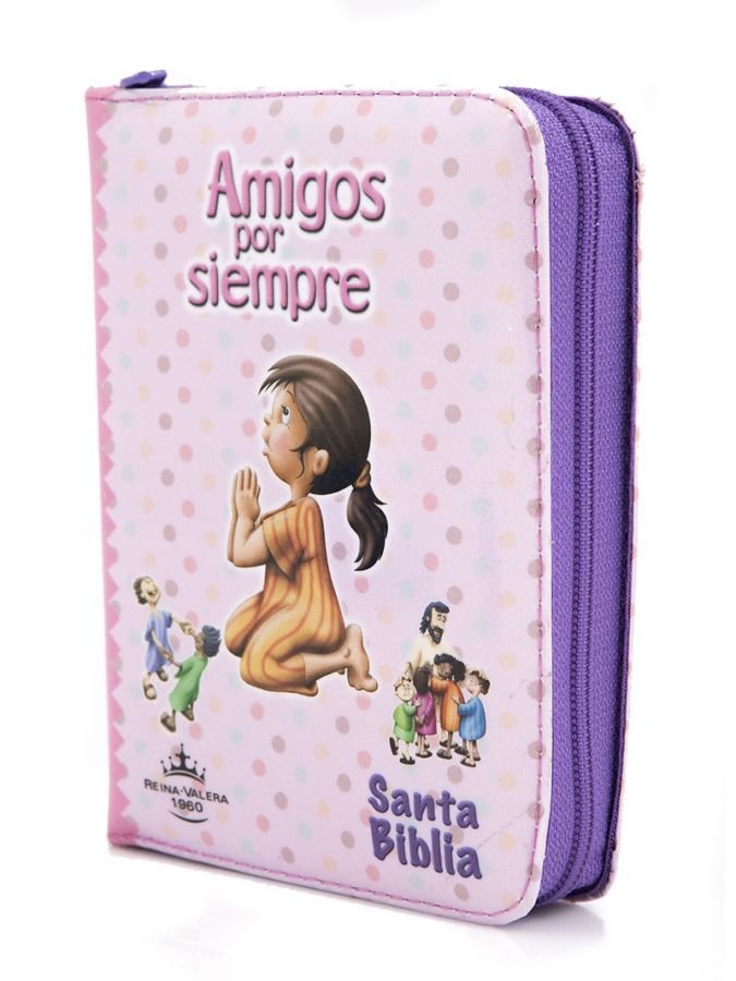 Amigos por siempre, esta biblia es diseñada especialmente para que las niñas conozcan las historias bíblicas de una manera atractiva, moderna, su cubierta hecha en un material que la hace resistente al agua y que pueda ser llevada con comodidad a cualquier lugar. Tipografía adecuada para niños y niñas de 7 a 11 años, 56 divertidas láminas en colores intercaladas en el texto bíblico, que ayudan en la fijación de las verdades bíblicas, Concordancia para que el niño aprenda a buscar temas de la Biblia y ayudas suplementarias que lo llevarán a conocer las Escrituras de una manera práctica y le guiarán en sus inicios de la vida cristiana